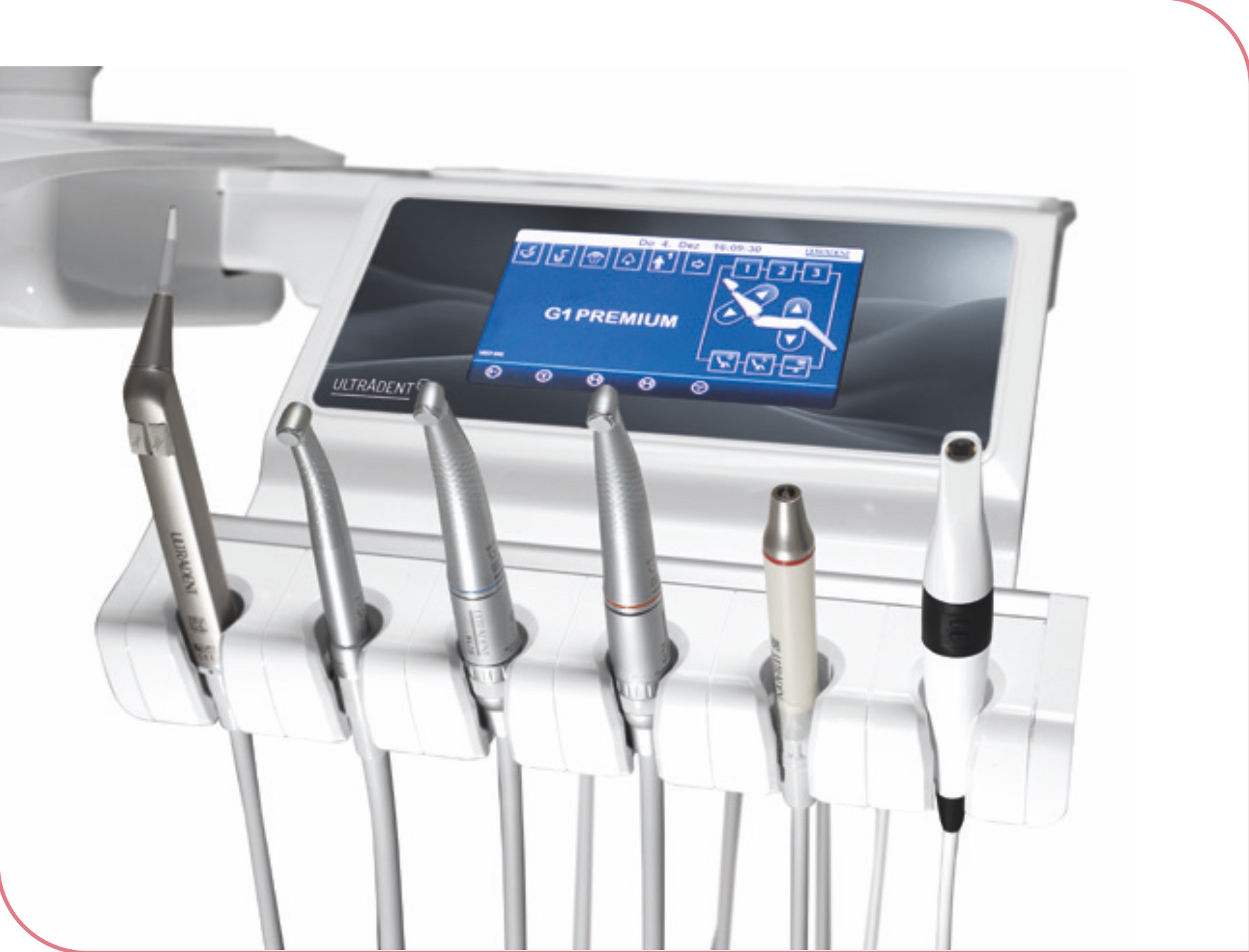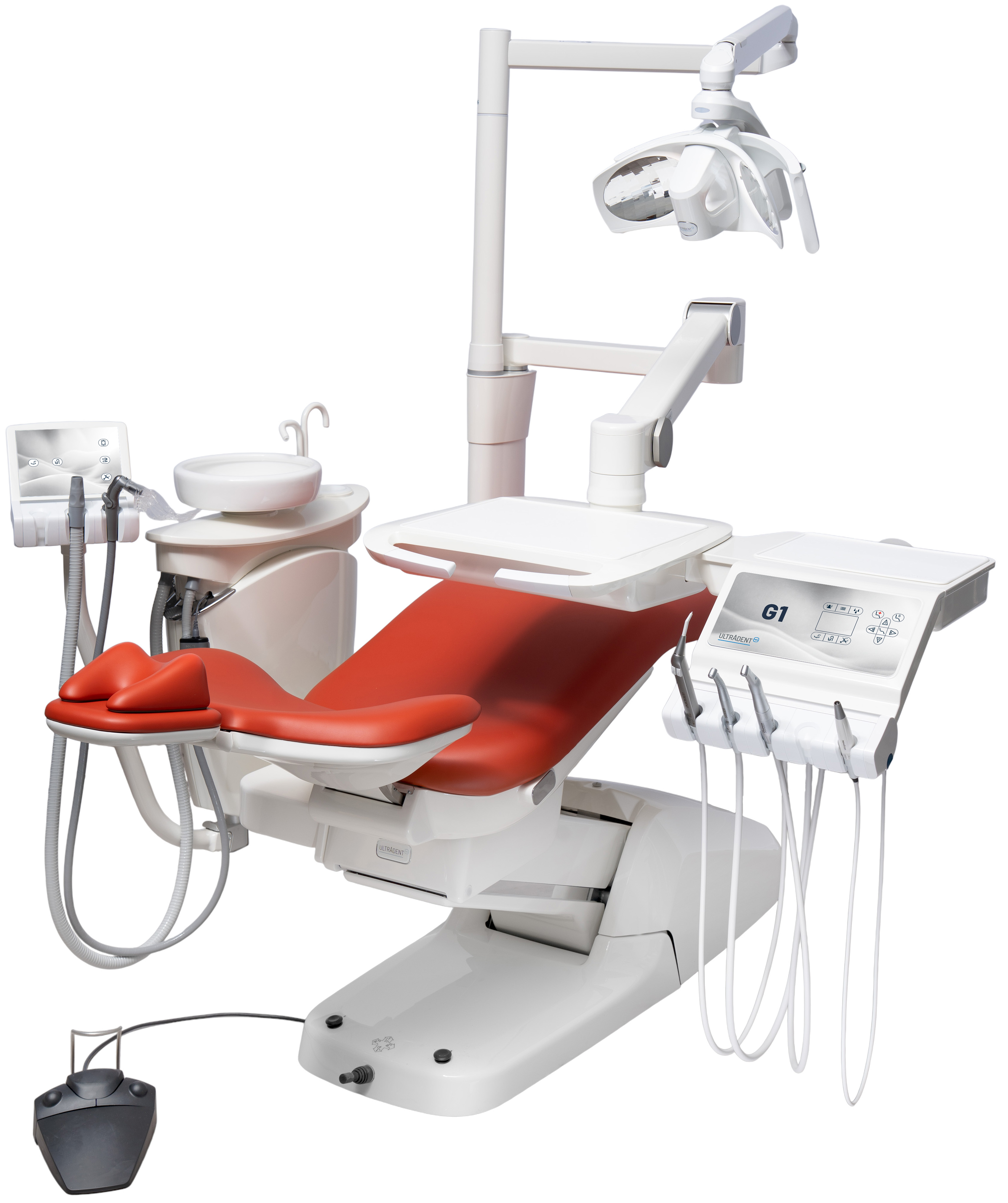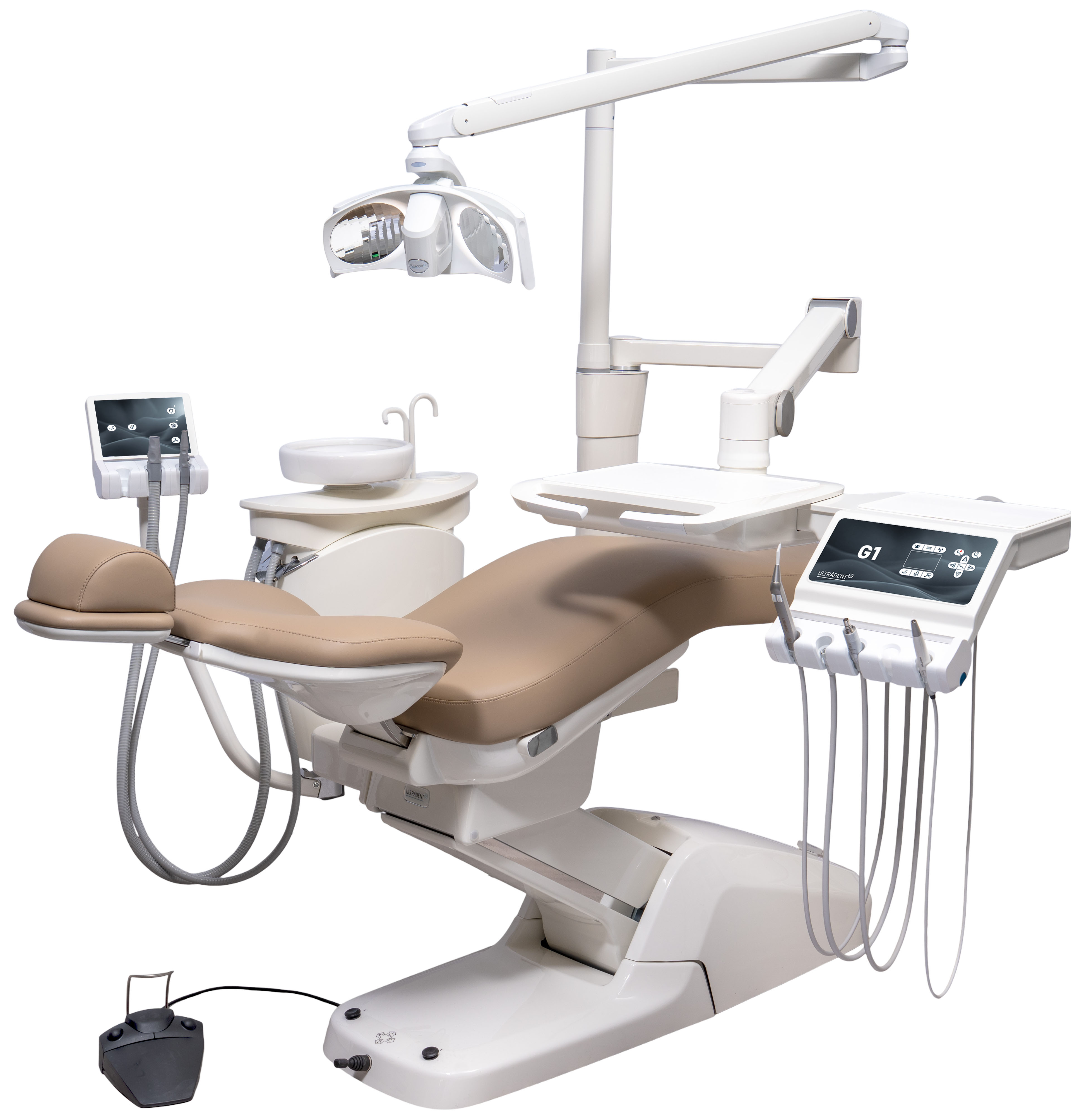 Die G1 überzeugt durch ihren synchronen Aufbau: Wassereinheit, Behandlungsleuchte, Trayablage und optionaler Monitor bewegen sich gemeinsam und sorgen für konstante Abstände bei jeder Höhenverstellung. Das Zahnarztelement Standard mit Foliendisplay bietet eine zuverlässige Leistungsregelung der Antriebe, hygienische Bedienung per Fußanlasser sowie eine durchdachte Serienausstattung für den täglichen Praxisbetrieb.